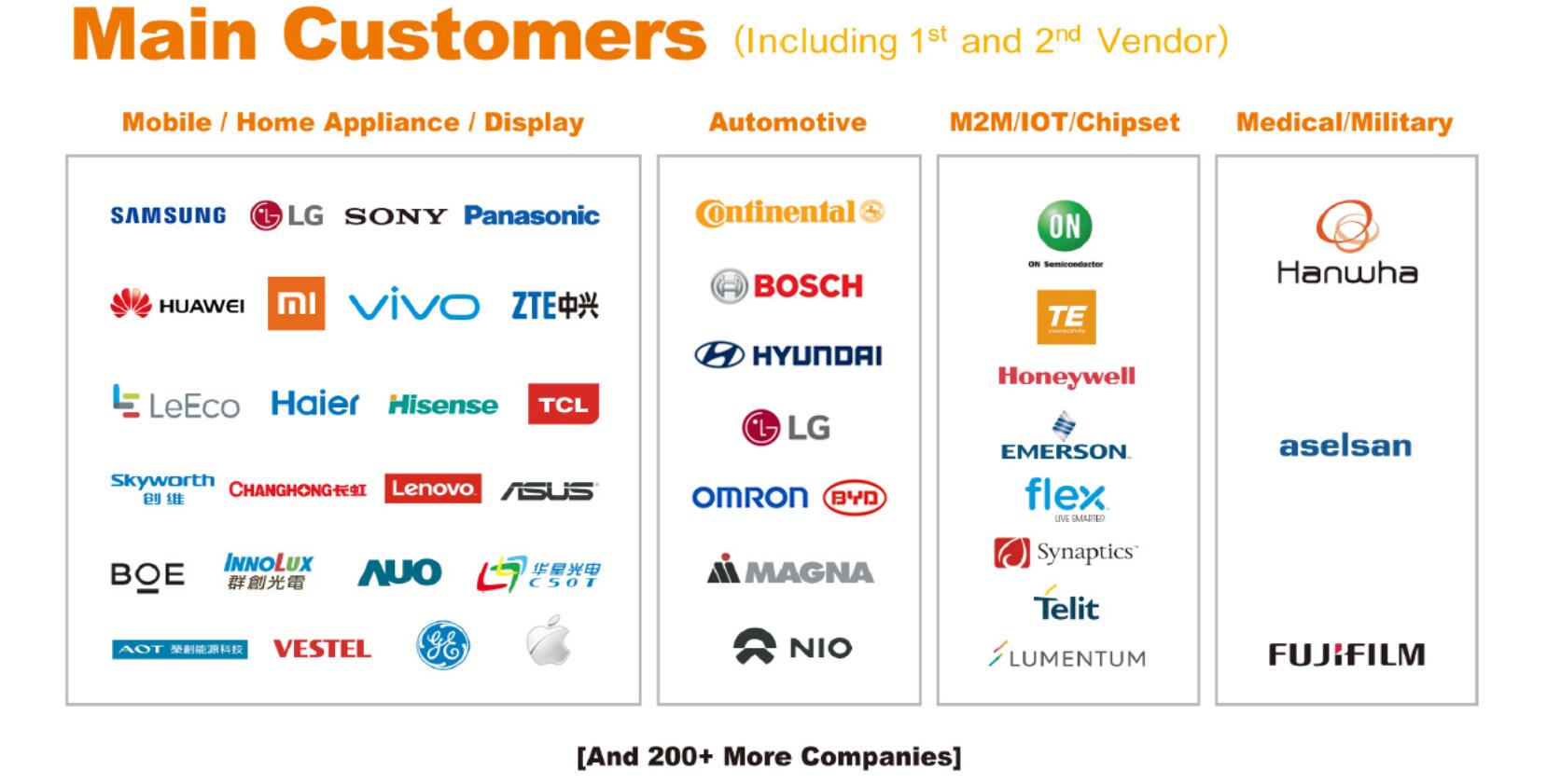 公司重視客戶利益和滿意度體系建設(shè),通過了ISO9000質(zhì)量管理體系、ISO9001:2000質(zhì)量管理體系、歐盟RoHS管理體系、QC080000管理體系、TS16949體系等認(rèn)證,先后與青島海爾、青島海信、四川長(zhǎng)虹、富士康、清華同方、友達(dá)光電、美菱電器、惠而浦、廈華電子、緯創(chuàng)集團(tuán)、創(chuàng)維集團(tuán)、冠捷科技、偉創(chuàng)力、比亞迪、美的電器、京東、TCL、Arcelik、Vestel等國(guó)內(nèi)外著名企業(yè)建立了穩(wěn)固的合作關(guān)系,同時(shí)通過代工企業(yè)間接與HP、DELL、LENOVO、SONY、APPLE、夏普等品牌開展合作。